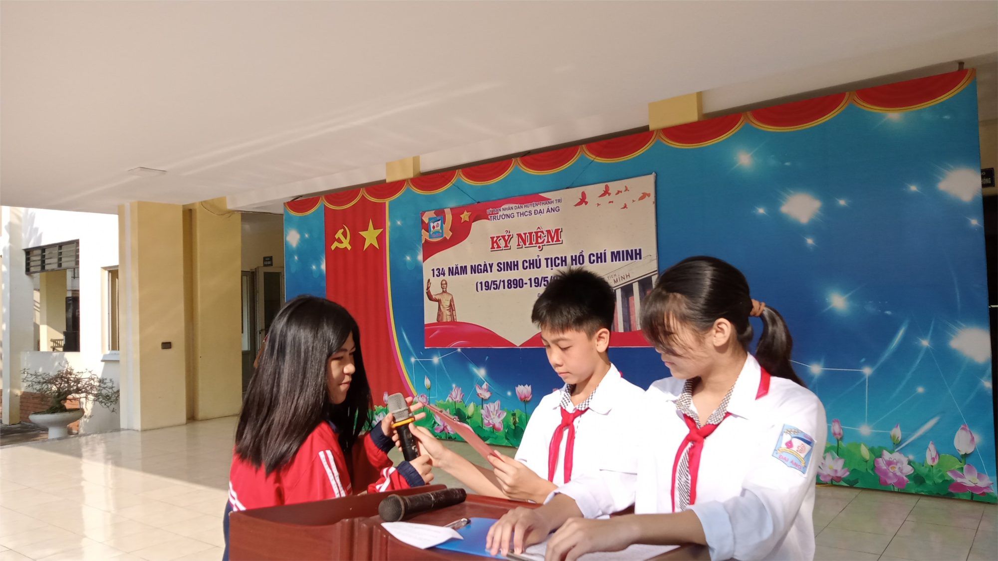 Tại buổi sinh hoạt ngoại khóa, tiết sinh hoạt dưới cờ tuần 35 của Trường THCS Đại Áng với chủ đề “Mừng sinh nhật Bác”, giáo viên, học sinh toàn trường được thưởng thức các bài hát về Bác Hồ. Cũng tại buổi hoạt động ngoại khóa, sau khi nghe các bài hát, các em học sinh tham gia các câu hỏi tìm hiểu về Bác Hồ. Nhờ được sự dạy dỗ của thầy cô, tấm lòng kính yêu với Bác cũng như tìm hiểu thực tế các em học sinh hăng hái tham gia trả lời câu hỏi, nhiều học sinh trả lời rất chính xác câu hỏi về cuộc đời của Bác.