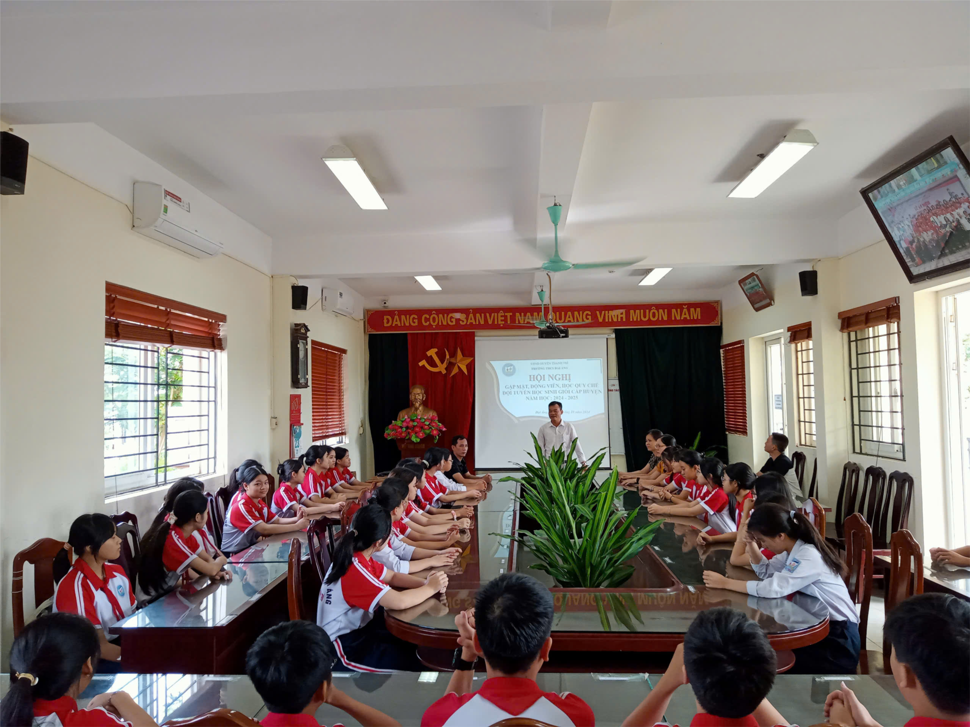Ngoài việc hướng dẫn cụ thể, chi tiết về các quy chế của kỳ thi học sinh cấp huyện thì đây là buổi giao lưu, chia sẻ, động viên, khích lệ các em là học sinh giỏi ở các bộ môn văn hoá. Thầy giáo Đào Mỹ Trung – Phó Bí thư chi bộ, Phó Hiệu trưởng nhà trường đã phát biểu động viên tinh thần các em học sinh trước kì thi HSG cấp huyện vào ngày 25/10/2024. Thầy Phó Hiệu trưởng đánh giá cao những nỗ lực, cố gắng, vượt khó của các em trong suốt quá trình học tập trên lớp và trong thời gian ôn luyện đội tuyển, thầy kỳ vọng các em sẽ mang lại bảng vàng thành tích về cho nhà trường, xứng đáng với truyền thống khoa bảng của quê hương, trở thành niềm tự hào và cũng là tấm gương cho các thế hệ các em học sinh của nhà trường mai sau: “Hôm nay chúng em tự hào về nhà trường, ngày mai nhà trường sẽ tự hào về chúng em”.
