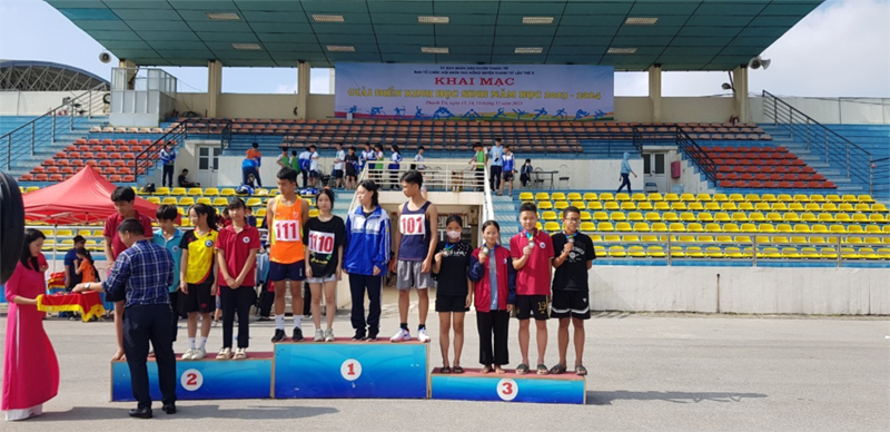 Ngày 14/12/2023 các em tham dự xuất sắc đạt 3 giải, trong đó có 01 Huy chương Vàng, 02 Huy chương Bạc ở nội dung nhảy cao nam, nhảy xa nam và chạy 400m nam. Cụ thể em Tô Văn Kiên lớp 9C xuất sắc giành hai huy chương (01 huy chương Vàng nhảy cao, 01 huy chương Bạc nhảy xa), em Tô Văn Thành Hải lớp 9D xuất sắc đạt huy chương Bạc chạy 400m nam.