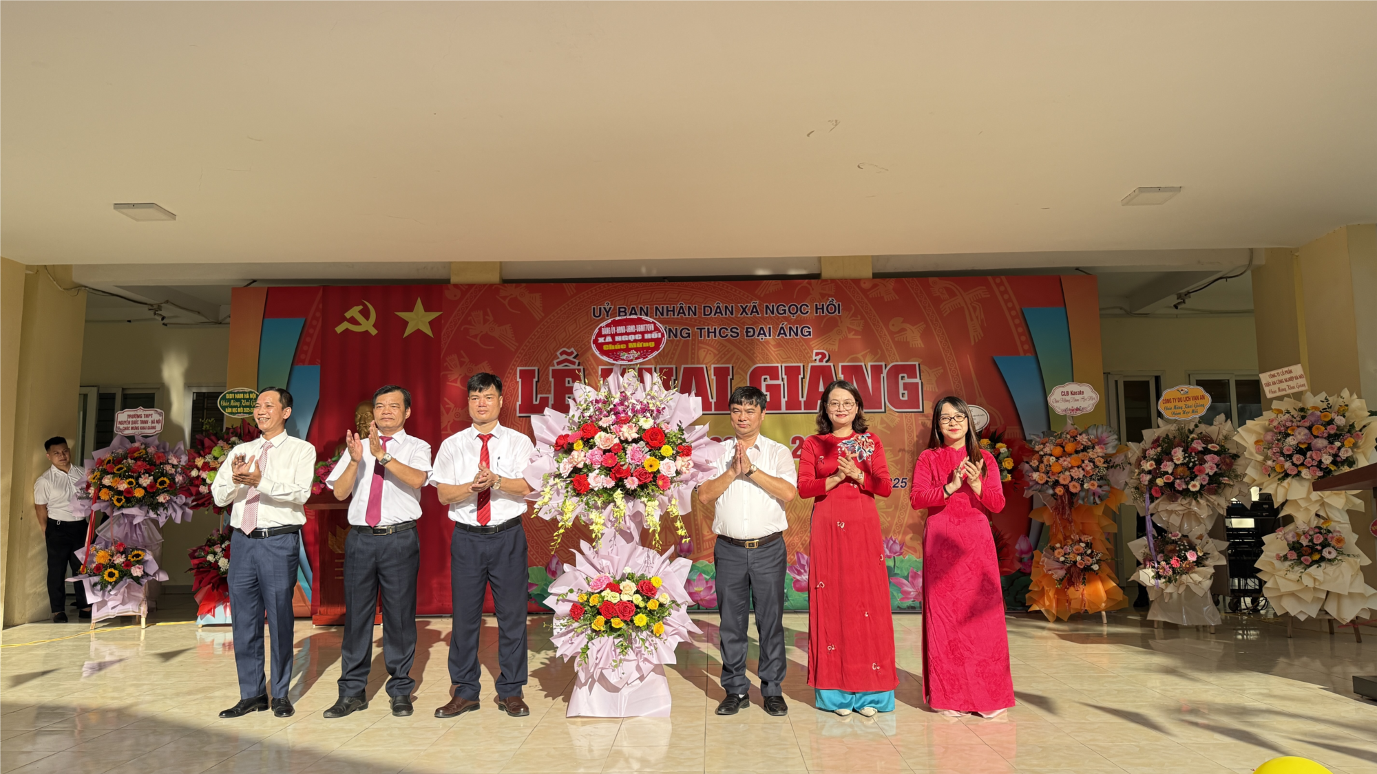 Đối với trường THCS Đại Áng, bắt đầu từ 7h00 trong không khí rộn ràng, vui tươi, dưới ánh nắng thu vàng, các quý vị đại biểu, thầy và trò nhà trường thực hiện đón các em học sinh lớp 6, thế hệ thứ 63 của trường THCS Đại Áng mến yêu. Sau phần đón các em học sinh lớp 6 thầy và trò nhà trường vinh dự được đón nhận bó hoa tươi thắm chúc mừng của lãnh đạo Đảng uỷ, HĐND, UBND, UBMTTQ Việt Nam xã Ngọc Hồi cùng các bó hoa tươi thắm của đại diện Hội CMHS, các cơ quan, đoàn thể, doanh nghiệp trao tặng.